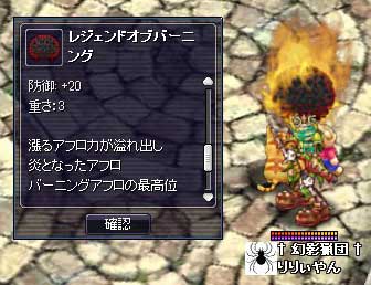 レジェンドオブバーニングは装備効果はいいんですが、燃えるエフェクトが多い(装備者が多い)とかなーり重いです。装備しなくても確定する狩り場ではなるべく付けないようにしたほうがいいかも…。