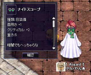 個人的にこのスコープはなかなか見た目いいと思うんですけどどうでしょう。能力的には既に課金の顔アイテムを持っているので不要なのですが、色が緑系というのもポイントかもしれない。弓には合ってると思います。